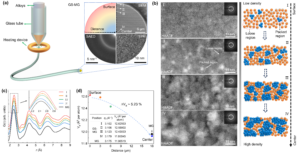 最近,松山湖材料实验室绿色非晶合金团队孙保安研究员联合南京理工大学冯涛教授、湛诚教授、陈双琴副教授在非晶合金的应变工程应用方面取得了重大突破。研究人员通过设计出具有梯度结构的非晶合金丝材(GS-MGs),成功实现了利用对非晶合金的应变调控提升其电催化性能。研究人员利用HAADF-STEM、纳米压痕以及热力学测试等多角度结构表征技术,证明了通过改进的Taylor–Ulitovsky技术制备出的Ni40Fe40P20 (NFP)非晶合金丝材具有显著的梯度结构,具体体现在从内部到表面的原子密度逐渐降低,表面具有更低的原子堆积密度以及更高的能量状态。同时,在Ni基、Fe基、Co基以及Pd非晶合金丝中均发现了这种梯度结构普适性存在的结果,进一步证明了梯度结构设计的广泛适用性。