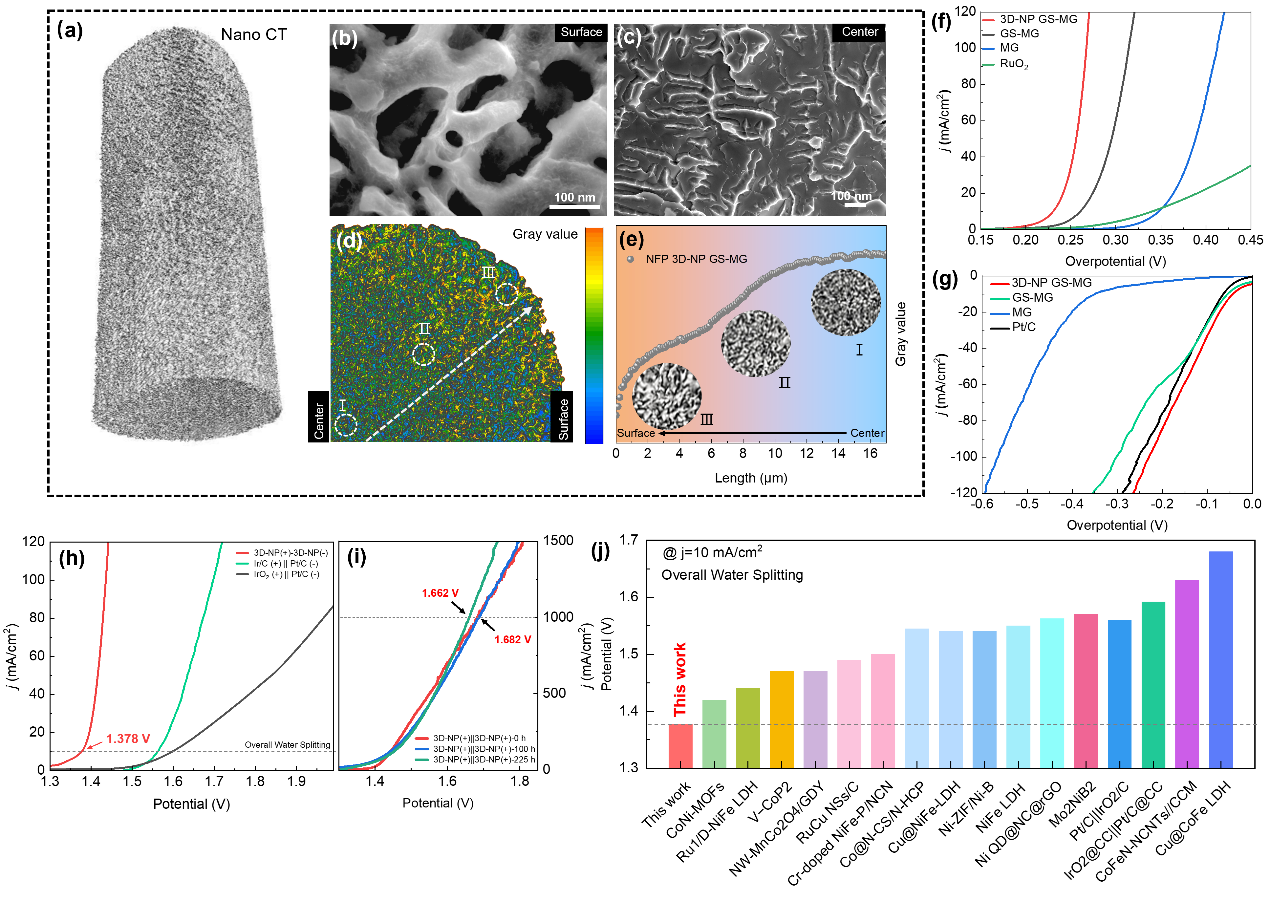 研究发现,这种GS-MG在阴极的析氢反应(HER)和阳极的氧化反应(OER)中表现出了远超传统MG的电催化性能。结合密度泛函理论(DFT)的模拟计算结果表明,NFP非晶合金中密度的降低会导致d-band中心上移,从而增强了其与吸附物之间的相互作用,这一特性非常有利于HER和OER的反应过程,进一步证实了GS-MG梯度材料对于提升电催化的重要贡献。接着,研究人员利用Nano-CT技术发现,这种梯度非晶结构有利于其在化学脱合金过程中形成特殊的三维纳米孔结构(3D-NP),其在整体水分解反应中表现出了突破性的性能。在10 mA/cm2电流密度下,NFP非晶合金展现出低至1.378V的电势,而在1000 mA/cm2电流密度下,其电势为1.682V,并且维持了长时间下的优异稳定性。这一表现证明了应变工程策略在提升非晶合金催化性能方面的巨大潜力。