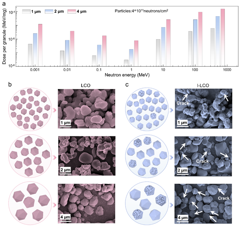 图2 (a)不同粒径钴酸锂中子辐照剂量损失(模拟计算结果);(b, c)未辐照和辐照后三种不同粒径钴酸锂的微观结构变化。