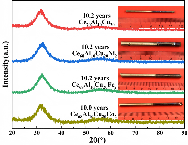 图1. Ce基合金在自然老化10年后仍保持非晶结构。XRD图谱显示,Ce70Al10Cu20及其微合金化样品在自然老化超过10年后仍未发生晶化。插图为老化后样品实物,表面氧化但内部仍具金属光泽。