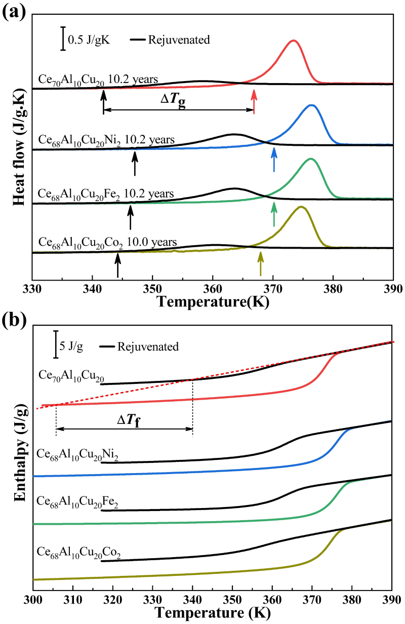 图2. 十年老化前后不同样品的(a)DSC热流曲线与(b)焓曲线?;『辖鹄匣骉g显著升高、Tf明显下降,表现出典型的超稳定特征;微合金样品的变化幅度减小。