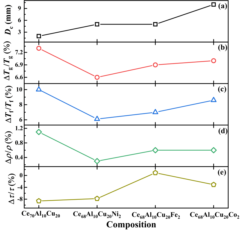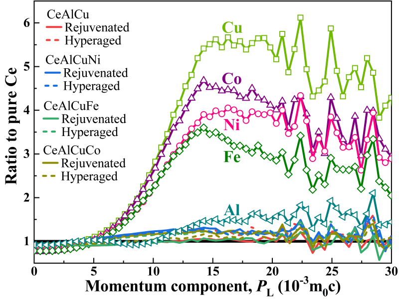 为了揭示结构演化机制,进一步通过正电子湮灭能谱(Positron annihilation spectroscopy)与多普勒展宽能谱(Coincident Doppler Broadening,CDB)分析其微观结构演化,发现基础合金在老化过程中其类空位结构显著收缩,而在Fe与Co微合金样品中,类空位几乎没有变化。CDB谱表明所有样品中空位周围的化学环境主要由Ce原子主导,表明结构周围化学环境稳定。这些结果说明,过渡金属元素与Ce之间存在强相互作用,抑制了Ce原子的局域扩散与类空位结构的重构,阻碍了微合金化样品在老化过程中的进一步结构致密化。
