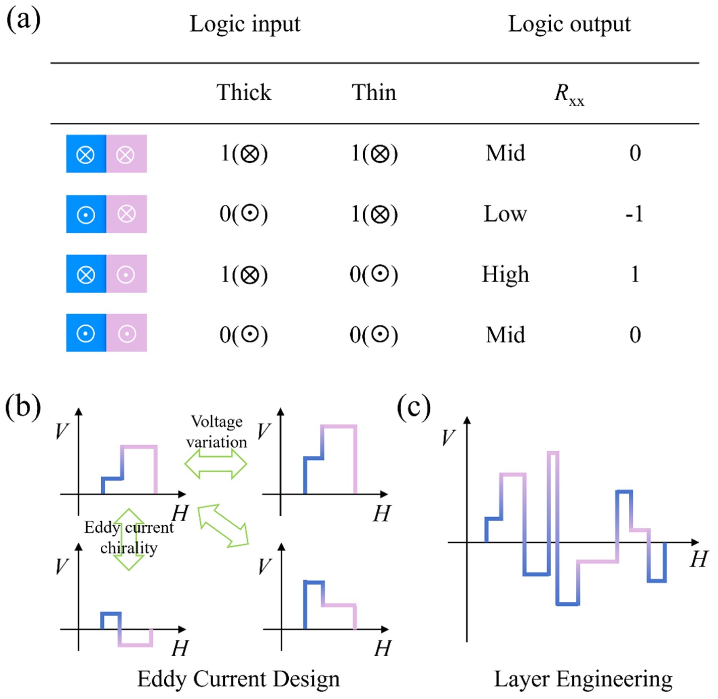 图2. 阶梯式Fe3GaTe2自旋逻辑真值表及通过涡流手性设计和电压变化对其调制形成复杂的电阻谱