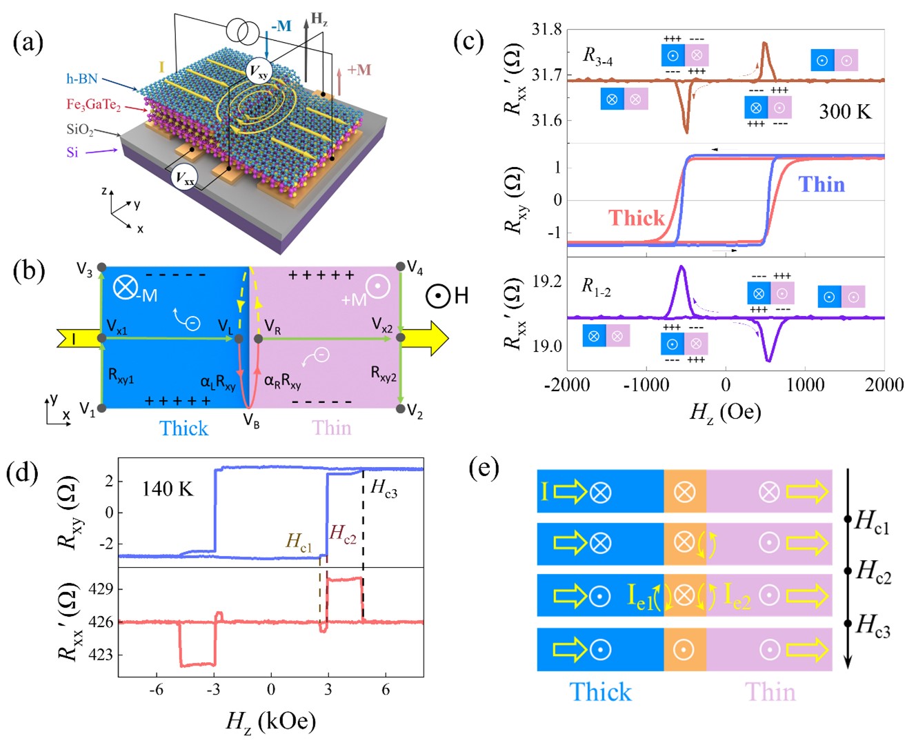 图1. 阶梯式Fe3GaTe2器件在不同温度下的反对称磁阻及霍尔电阻与机制示意图