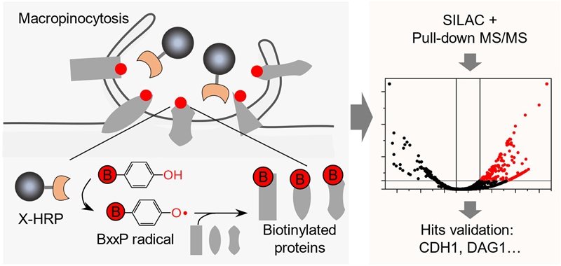传统研究方法,如基于磁性纳米颗粒的囊泡分离、NP处理后的全细胞蛋白质组学分析,或过氧化物酶介导的全细胞表面生物素化标记,虽可部分揭示与NP相关的膜蛋白,却因缺乏时空特异性,难以精确捕捉NP结合位点附近的蛋白互作网络。本工作发展了一种基于“邻近标记技术”的高分辨蛋白质组学分析方法,揭示了不同巨饱饮作用亚型相关膜蛋白组的异同,为面向精准医学的靶向纳米药物设计中“疾病生物标记物筛选”环节提供了有效策略。