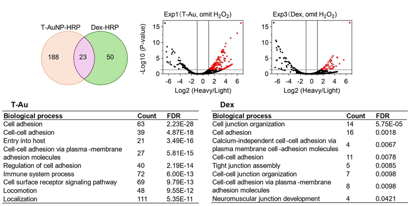 实验结果表明,HRP的共价连接对纳米颗粒的粒径、表面电位及细胞摄取效率影响极小,且HRP仍保持高酶活,可实现高效的邻近标记。使用膜不透性BxxP可特异性标记细胞表面蛋白,避免胞内背景信号干扰。SILAC质谱分析显示,受体依赖性MP(以T-Au-HRP为示踪)富集到211种独特蛋白,而传统MP(Dex-HRP示踪)仅富集73种,两者共同蛋白仅23种,表明不同MP类型在蛋白质组层面具有显著区别。功能注释提示,T-Au特异性蛋白多与信号转导、细胞运动与迁移相关,而Dex相关蛋白则更多参与细胞黏附过程,反映出不同MP亚型在内吞机制上存在功能分化。