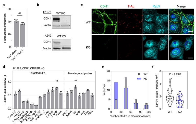 功能实验进一步验证了CDH1(E-cadherin)作为关键调控因子:尽管CDH1并非TAT肽的直接受体,其敲除显著抑制了TAT-NP的摄取,并对Dex和BSA等传统MP示踪物的内吞也产生部分影响。电镜观察显示CDH1缺失并不改变囊泡尺寸,但导致每个囊泡内纳米颗粒数量明显减少,表明其在颗粒–受体复合物稳定、膜皱褶形成及内吞囊泡生成中起辅助作用。CDH1在内吞囊泡中随时间动态累积,进一步支持其在MP过程中的功能性角色。