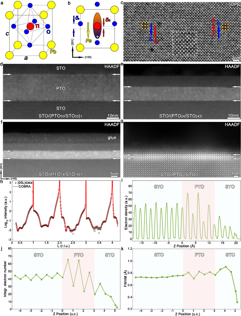 在过去的五年中,人们从实验和理论两个方面对铁电斯格明子-泡泡(ferroelectric skyrmion-bubbles)进行了系统性探索,揭示了斯格明子-泡泡的形成是由块体能、梯度能、弹性能和静电能之间复杂相互作用共同决定的。这些斯格明子-泡泡展现出了诸如手性、负电容效应以及拓扑相变行为等。然而,与Dzyaloshinskii-Moriya相互作用不同,偶极子-偶极子相互作用是无手性的,这意味着它们在能量上更倾向于形成布洛赫型斯格明子。铁电奈尔型斯格明子的形成需要显著的电荷积累,以补偿电极化径向梯度的散度。畴结构工程是在单层四方铁电薄膜中实现多样化、弱化奈尔型和布洛赫型相关性的一种可行策略。因此,先前的理论研究曾提出奈尔型斯格明子存在的可能性较低,这也使得探测与研究它们更具有挑战性。在此,我们通过研究[(PbTiO3)n/(SrTiO3)n]1双层膜中斯格明子-泡泡随厚度的演化(图1),观察到在厚度为2个单胞的超薄双层膜中纯奈尔型斯格明子的原子形态,其拓扑荷为±1。通过极化分析、几何相位分析和X射线3D倒易空间映射(RSM)相结合的实验手段,确认了这种纯奈尔型斯格明子的存在。我们发现,当双层膜的厚度从50个单胞降低到2个单胞时,同时具备奈尔和布洛赫特征的斯格明子-泡泡结构中的布洛赫特征完全消失,仅保留纯奈尔型斯格明子特征(图2)。通过相场模拟揭示了奈尔型斯格明子的形成机制,计算表明静电能和梯度能变化在稳定奈尔型斯格明子相中起到了关键作用(图3)。这些纳米尺度的纯奈尔型斯格明子代表了磁性对等物的电学等价物,拓展了拓扑相的尺寸极限,并为铁电物理学领域的进一步发展提供了潜在的推动力。