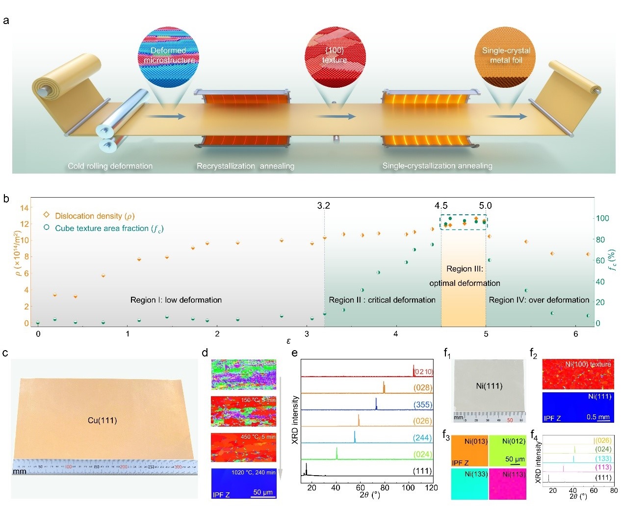 图1 a. 单晶金属箔的织构调控制备策略。b. 单晶铜箔制备的通用调控框架,具体包括冷轧过程中几何必要位错密度(??)随真应变(ε)的变化以及再结晶退火后对应的立方织构面积分数(??c)的变化。c. 所制备单晶Cu(111)箔的实物图(33×20 cm2)。d. 区域III中冷轧铜箔在再结晶和单晶退火过程中的原位组织演变。e. 所制备的单晶铜箔的XRD图(2??,银靶)。f1-f4. 所制备的单晶Ni(111)箔的实物图(6×5 cm2)、EBSD图和XRD图(2??,银靶)以及高指数晶面单晶镍箔的EBSD图和XRD图(2??,银靶)。