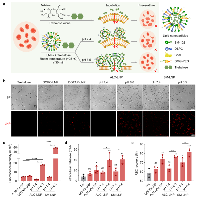 该技术的核心在于LNP的智能pH响应特性。在生理pH(7.4)环境中,LNP呈电中性,与红细胞相互作用较弱。当环境变为温和酸性(pH 6.5)时,LNP表面的离子型脂质发生质子化,使其表面带上正电荷。这随即引发其与带负电荷的红细胞膜之间的静电相互作用,并促进二者发生直接的膜融合。通过这一过程,LNP所包裹的海藻糖得以被高效地释放到红细胞的胞质中。