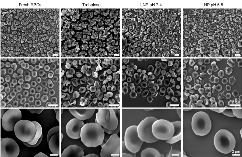 图2. 扫描电子显微镜(SEM)图像展示了不同方法冷冻保存后红细胞的形态。仅用海藻糖溶液冷冻保存的红细胞(左2列)出现了明显的变形和损伤,而经由LNP (pH 6.5)技术保存的红细胞(右1列)在冻融后,仍保持了健康的双凹盘状结构;LNP (pH 7.4)策略效果略差(右2列)。