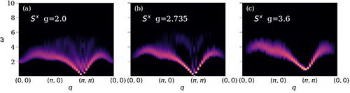 该团队运用量子蒙特卡洛和随机解析延拓的大规模计算方法 (quantum Monte Carlo and stochastic analytic continuation) ,计算了 图1 (a) 和 (b) 的两种相变过程中系统的自旋激发谱,结果总结在 图2 和 图3中。图2 (a), (b) 和 (c) 是去禁闭量子相变对应的过程。图1 (a) 系统仍在 AFXY 相里,能谱上得到自旋波的图像,在 (π, π) 点处自旋波为无能隙的 Goldstone 模,在其他动量点上自旋波色散开来,谱线在能量上的展宽来自于自旋波之间的散射。但在 图4 (b) (?可能就是2(b))中,系统接近 DQCP,整个能谱在 w(能量) – q (动量) 空间上生成出漂亮的连续谱。这连续谱有几个突出的特点: