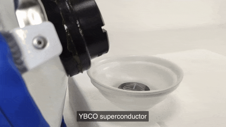 有了高温超导,就能直观地演示超导体的完全抗磁性了。首先用液氮将超导体冷却。